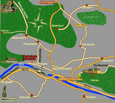 | Anreise von Dresden über die A17 bis Abfahrt Pirna. In Richtung Zentrum kommen Sie direkt auf die B172, die über Königstein nach Bad Schandau führt. Auf der Abfahrt der Elbbrücke fahren Sie rechts ab von der Hauptstraße in Richtung Hohnstein nach Rathmannsdorf. In Rathmannsdorf fahren Sie links in die ausgeschilderte Abfahrt in den Ort Prossen. Am Ende von Prossen am Wendeplatz geht es rechts auf die Bergstraße, gleich am Anfang ist die Nummer 24. | |||||||||||||||||||||||||||||||